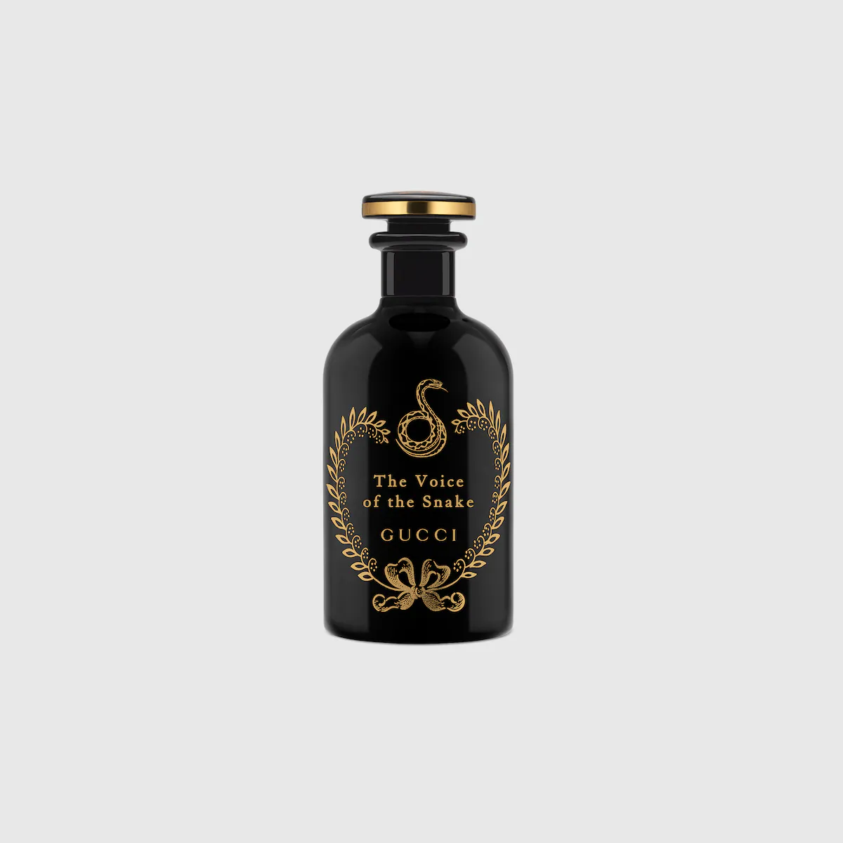 Bottle: A stunning, apothecary-inspired black lacquered glass bottle adorned with gold accents and a coiled snake illustration.
